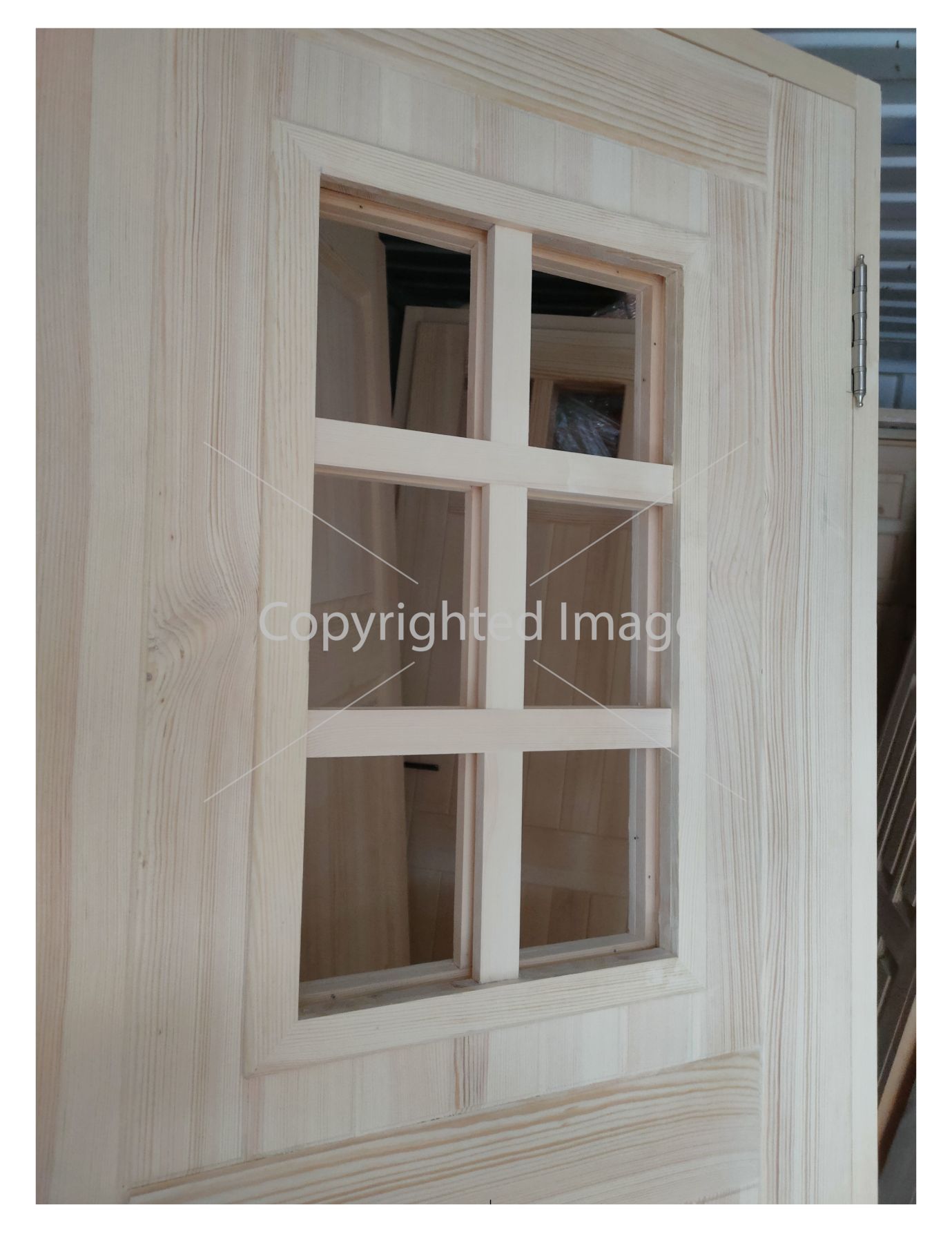 Дверной блок размером 2070х870 мм укомплектован ручкой (хром) ключ+ключ и навешен на петли ( 4 петли) ,дверной блок со стеклопакетом .Дверь толщиной 50 мм оснащена уплотнителем по контуру двери, собрана дверь из массива сосны, в производстве данной двери использовался, так называемый ''комель'' это нижняя часть ствола, в которой кольца древесные расположены намного плотнее друг к другу чем другой участок ствола дерева и делает материал из этой части более долговечный и стойкий к агрессивной среде,так как пористость в разы меньше и попадание влаги сокращаеться в разы. Под заказ